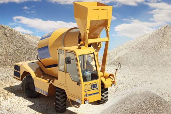 Autohormigonera Carmix con capacidad para 4750 lt, producción real de 3.5m3 por ciclo, descarga rápida con inclinación hidráulica y equipada con báscula electrónica digital, Tanque de agua de 900lt con autonomía para 2 ciclos.